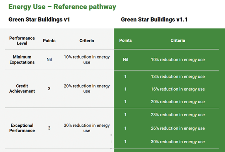 Like all Green Star tools, the next iteration of Green Star Buildings was developed with and for industry. While it continues to sharpen the focus on climate action, nature and circularity, it’s also more user-friendly and makes certification more accessible. A particular standout for me is the introduction of stepped points which give points to projects once they meet certain benchmarks within selected credits. You can see an example below for the energy use credit.